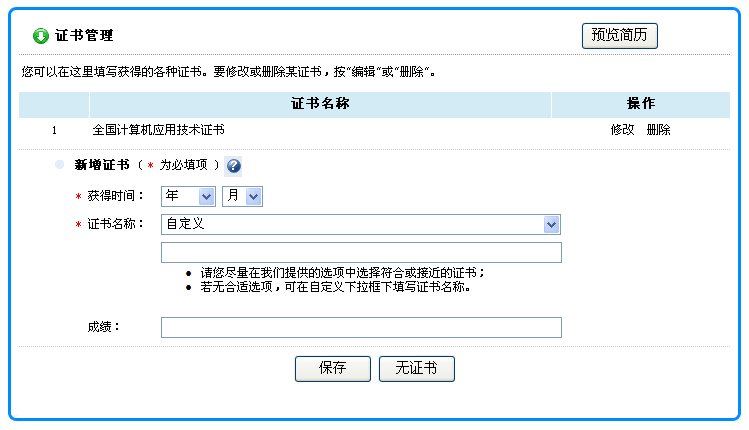 1)進(jìn)入"個(gè)人管理中心",位于左側(cè)子欄目的"簡(jiǎn)歷維護(hù)",點(diǎn)擊"個(gè)人證書(shū)管理"。